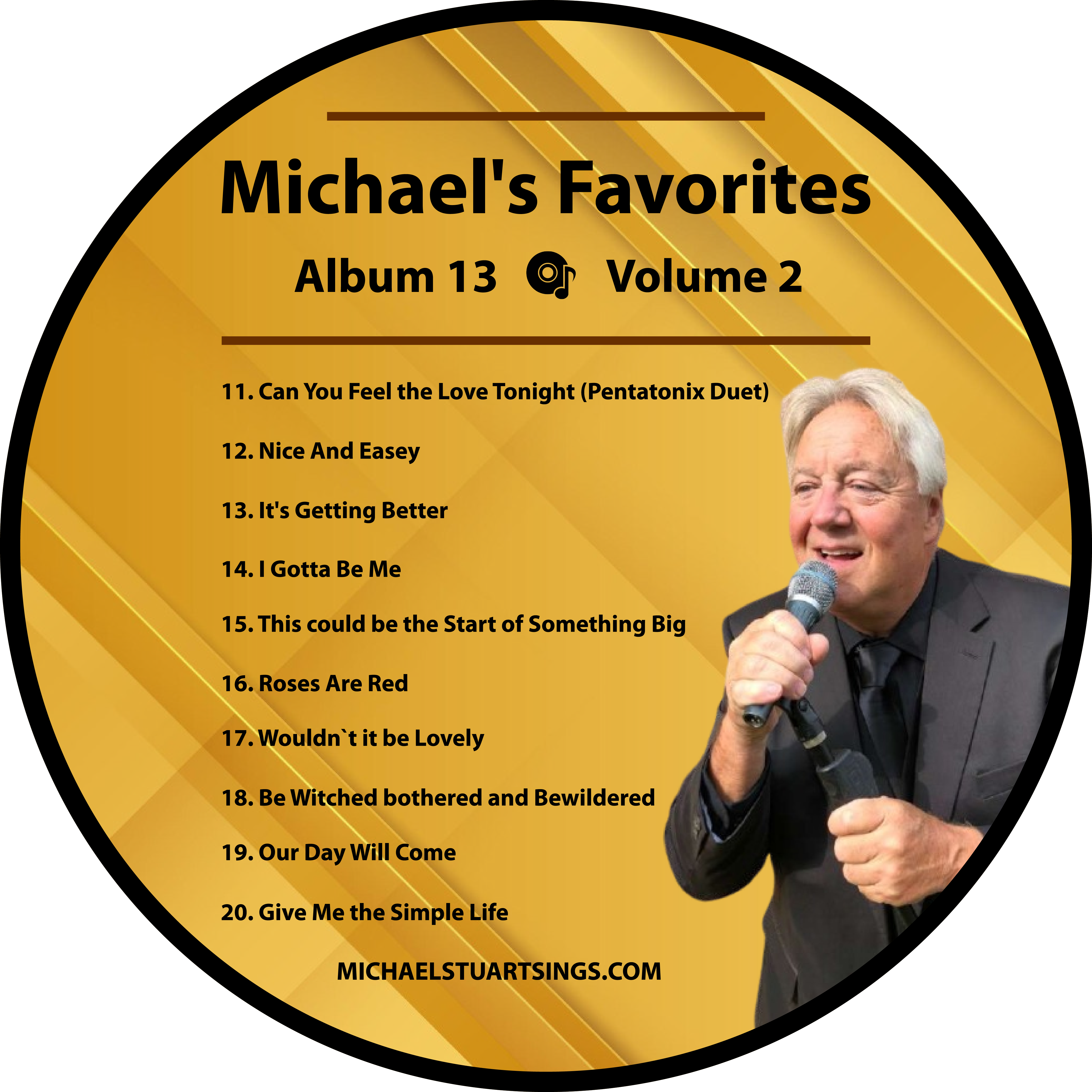 The following ten studio songs are Michael’s Thirteen Studio Album – Volume 2 Can You Feel the Love Tonight (Pantatonix Duet) https://michaelstuartsings.com/wp-content/uploads/2025/09/Can-You-Feel-the-Love-Tonight.mp3 Nice and Easy https://michaelstuartsings.com/wp-content/uploads/2025/02/01-keller-Nice-and-Easy.mp3 It’s Getting Better https://michaelstuartsings.com/wp-content/uploads/2025/02/08-Keller-Its-Getting-Better.mp3 I Gotta be Me https://michaelstuartsings.com/wp-content/uploads/2025/02/Keller-I-Gotta-Be-Me.mp3 This Could be the Start of Something Big https://michaelstuartsings.com/wp-content/uploads/2025/06/01-This-Could-be-the-Start-of-Something-Big.mp3 Roses are Red https://michaelstuartsings.com/wp-content/uploads/2025/06/01-Roses-are-Red-Final-Song.mp3 Wouldn’t it be Lovely https://michaelstuartsings.com/wp-content/uploads/2025/02/05-Keller-Wouldnt-it-be-Loverly.mp3 Bewitched, Bothered and Bewildered https://michaelstuartsings.com/wp-content/uploads/2025/05/01-LOFT-BEWITCHER-BOTHERED.mp3 Our Day Will Come https://michaelstuartsings.com/wp-content/uploads/2025/03/01-Our-Day-Will-Come.mp3 Give Me the Simple Life https://michaelstuartsings.com/wp-content/uploads/2025/08/Give-me-the-exportlast-simple-life.mp3 Follow